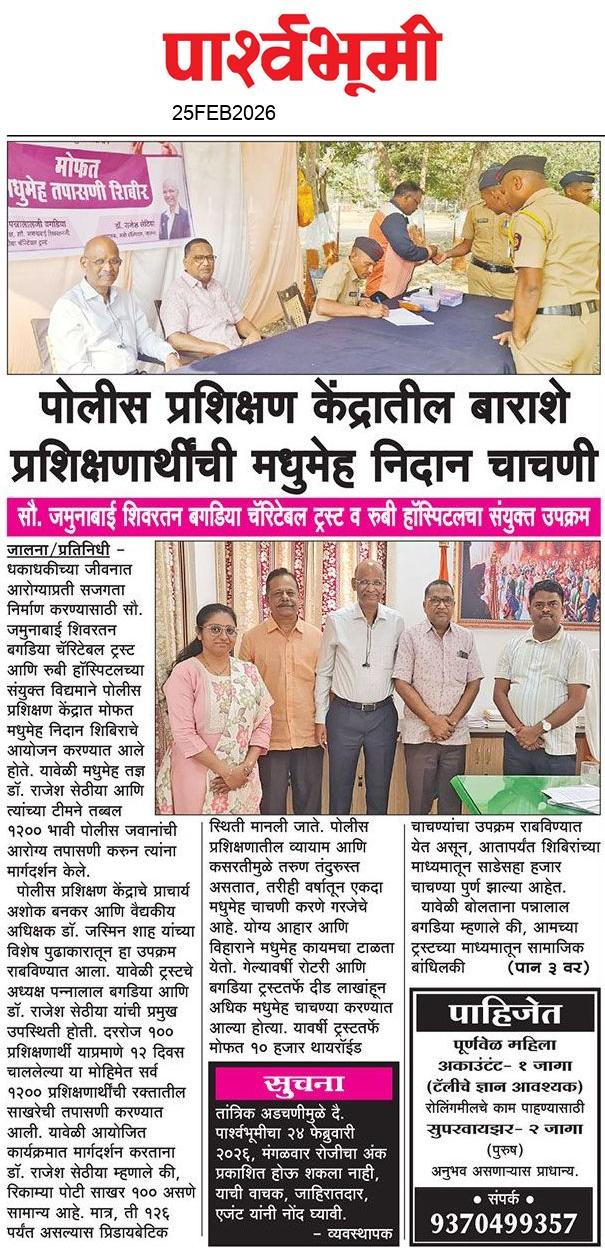 पोलीस प्रशिक्षण केंद्र जालना येथे प्रशिक्षण केंद्रातील पोलीस अमलदार व प्रशिक्षणार्थी यांची सौ. जमुनाबाई शिवरतन बगडिया चारिटेबल ट्रस्ट व रुबी हॉस्पिटल जालना यांचा संयुक्त उपक्रमाने मधुमेह चाचणी व इतर आरोग्य तपासणीचे शिबिर राबवून आरोग्य तपासणी करण्यात आली. यावेळी मा. प्राचार्य सर, वैद्यकीय अधिकारी श्रीमती डेकीवाडिया मॅडम, ट्रस्टचे अध्यक्ष श्री पन्नालालजी बगडिया आणि डॉक्टर राजेश शेठ या यांची प्रमुख उपस्थिती होती.