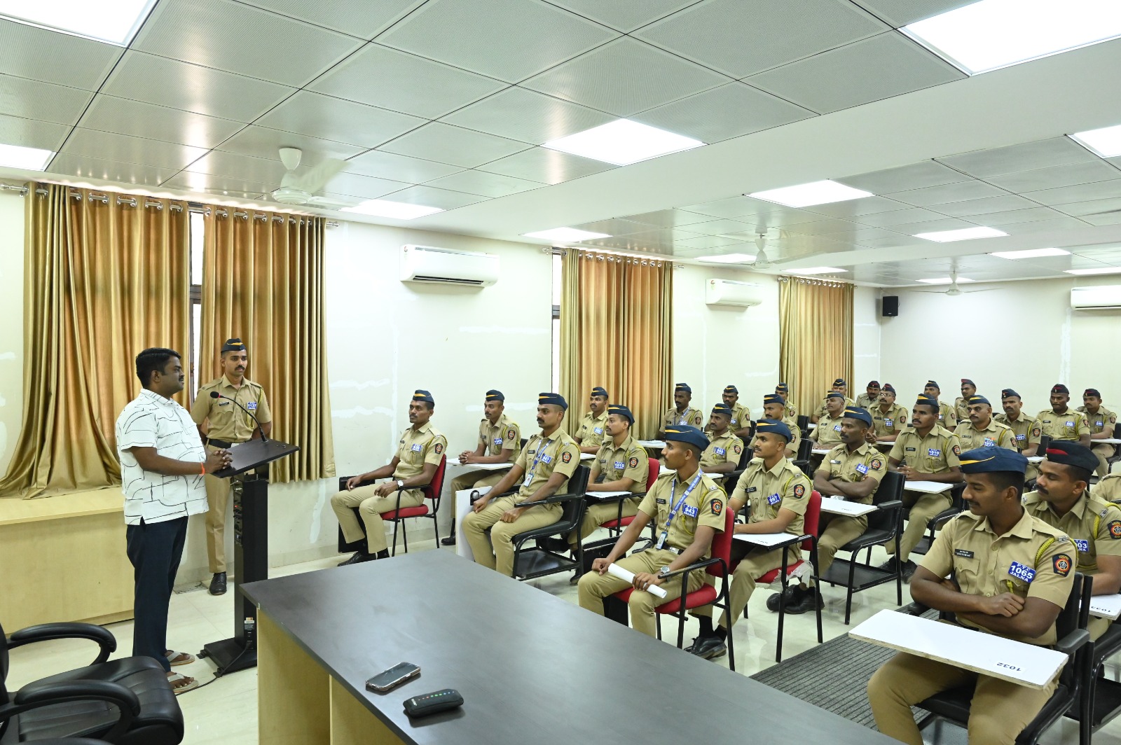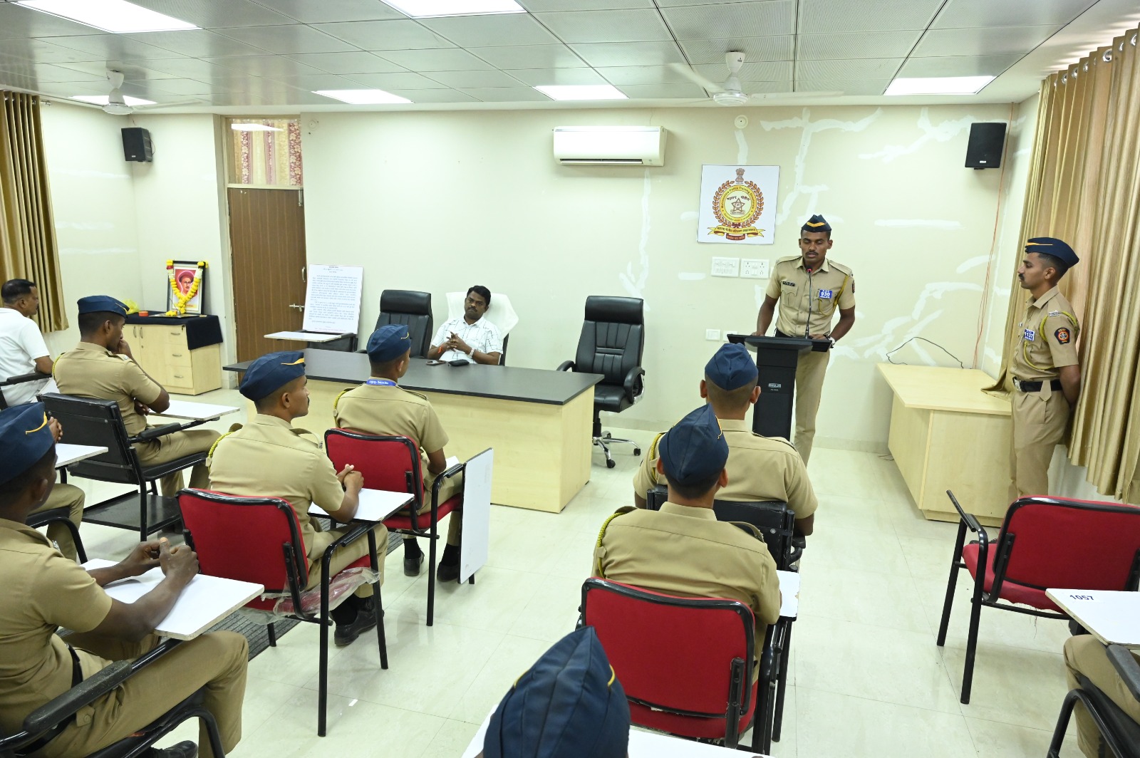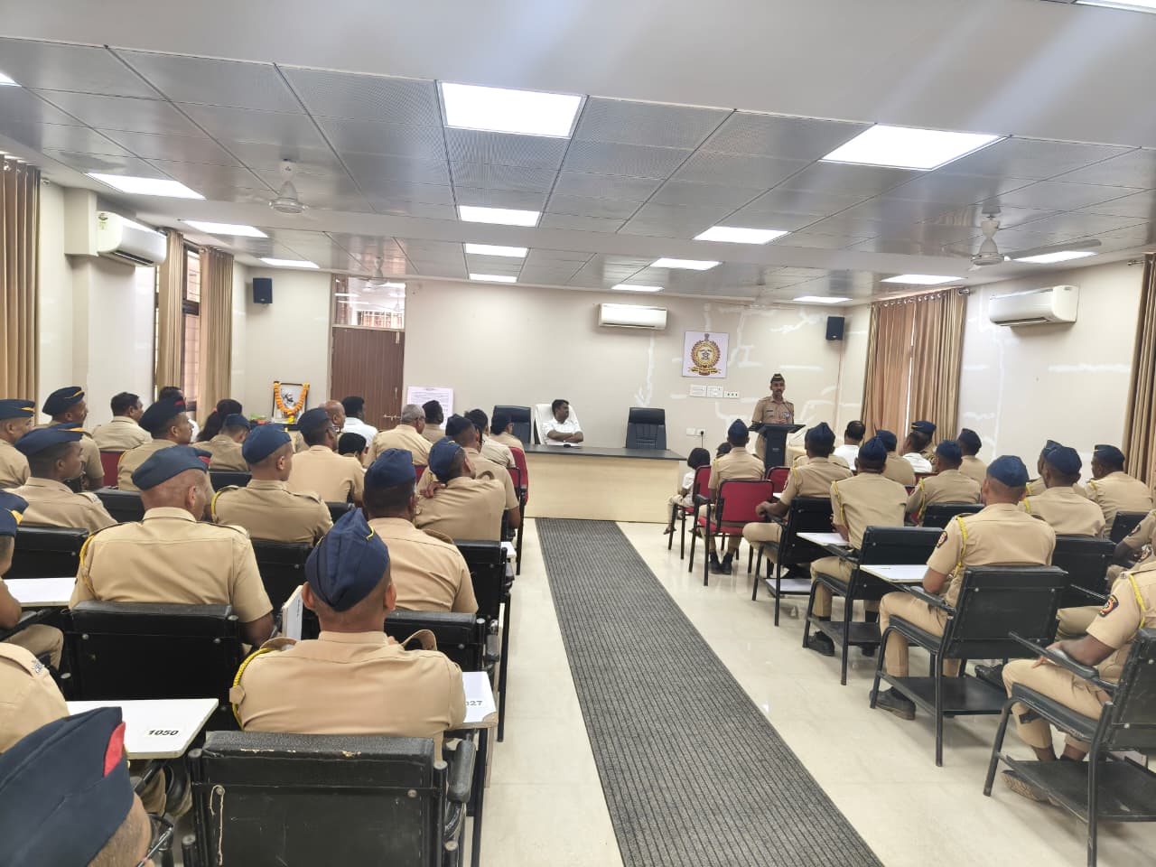 आज दिनांक 18 10 2024 रोजी सत्र क्रमांक 103 मधील 1213 नवप्रविष्ठ पोलीस प्रशिक्षणार्थी यांचा दरबार घेण्यात आलेला आहे. सदर दरबाराकरिता उपप्राचार्य अंतरवर्ग, उपप्राचार्य प्रशासन, अंतरवर्ग पोलीस अधिकारी, बाह्यवर्ग पोलीस अधिकारी,पोलीस अंमलदार आणि मंत्रालय कर्मचारी,कवायत निर्देशक हे हजर होते. सदरील दरबारामध्ये नवप्रविष्ट पोलीस प्रशिक्षणार्थी यांनी मांडलेल्या अडी – अडचणीचे निराकरण करून त्यांना मार्गदर्शन करण्यात आले आणि त्यांना मूलभूत प्रशिक्षणासाठी शुभेच्छा देण्यात आल्या
