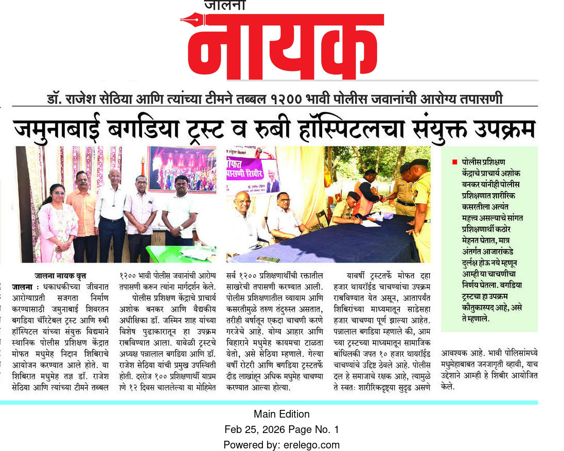 दिनांक 27 जानेवारी 2026 रोजी पोलीस प्रशिक्षण केंद्र, जालना येथे पोलीस अधिकारी व पोलीस कर्मचारी यांच्या कुटुंबियांकरिता जालना येथील सौ. जमुनाबाई शिवरतन बगडिया ट्रस्ट रोटरी क्लब ऑफ, जालना रेनबो या संस्थेमार्फत थायरॉईड टेस्ट शिबिराचे आयोजन करण्यात आले होते. यावेळी वैद्यकीय अधिकारी श्रीमती डेकीवाडिया मॅडम व रुग्णालयीन स्टाफ, अधिकारी/ कर्मचारी यांचे कुटुंबीय हजर होते. रुबी हॉस्पिटल, जालना येथील डॉक्टर सेठीया व त्यांच्या स्टाफ यांनी पोलीस अधिकारी, कर्मचारी व त्यांच्या कुटुंबीयांची थायरॉईडची तपासणी केली.